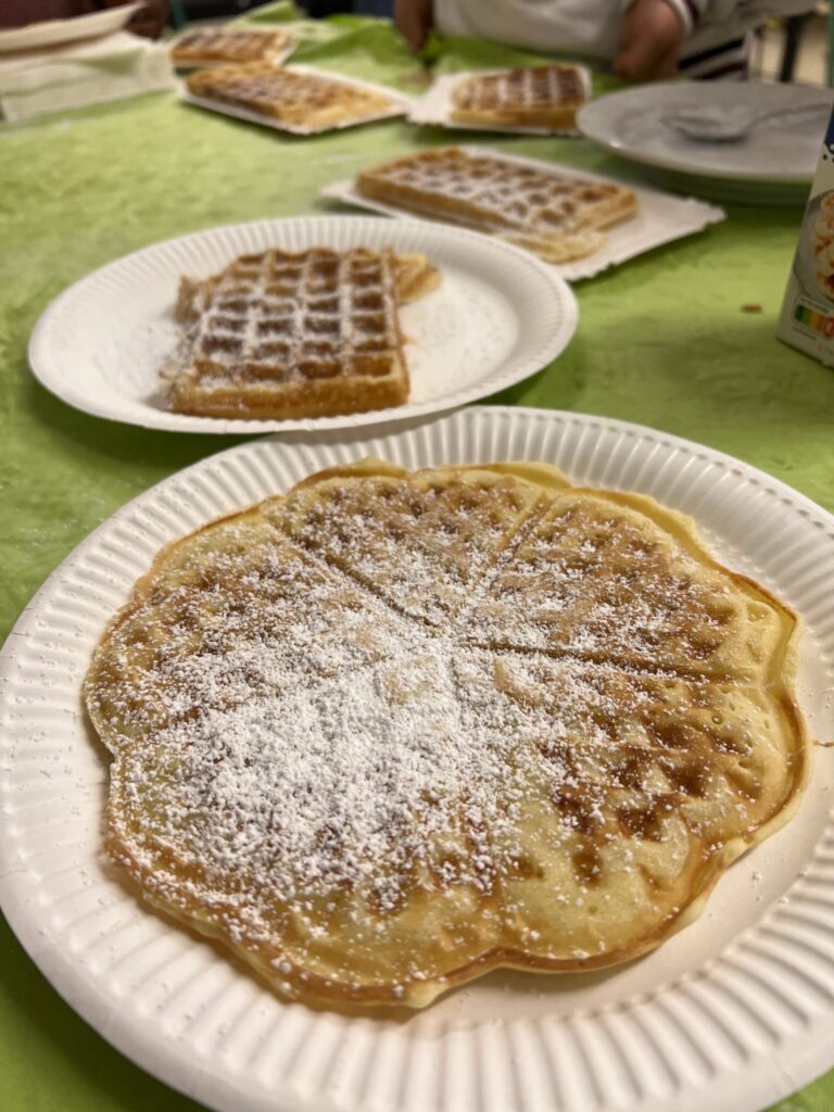 Eröffnet wurde der Nachmittag gemeinsam mit allen Beteiligten mit dem Lied „In der Weihnachtsbäckerei“. Dann ging es los: Es gab leckere Speisen, die von den Eltern vorbereitet wurden, und eine stark nachgefragte Waffelbäckerei. Viele Kinder waren bei den Bastelangeboten fleißig und motiviert.
